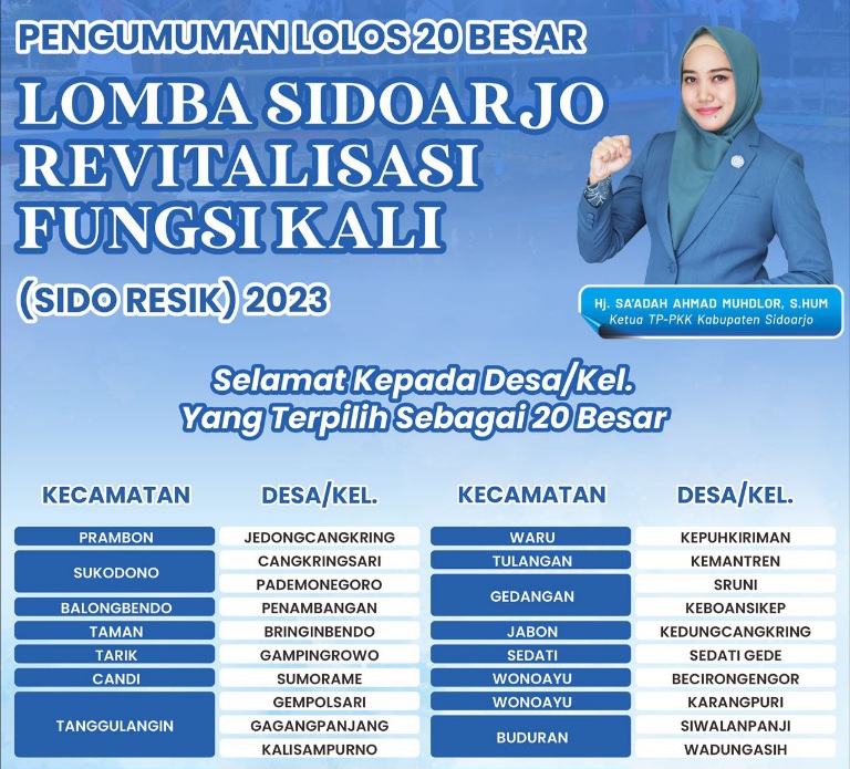 SIDOARJO (RadarJatim.id) — Ketua TP. PKK Kabupaten Sidoarjo, Hj. Sa’adah Ahmad Muhdlor mengumumkan 20 besar pemenang lomba “Sidoarjo Revitalisasi Fungsi Kali (Sidoresik) Tahun 2023”. “Lomba Sidoresik ini telah kami adakan mulai 1 September hingga 8 Desember 2023, dan hari ini sudah tersaring 20 besar untuk masuk ke tahap verifikasi lanjutan,” ucap Ning Sasha sapaan akrab […]